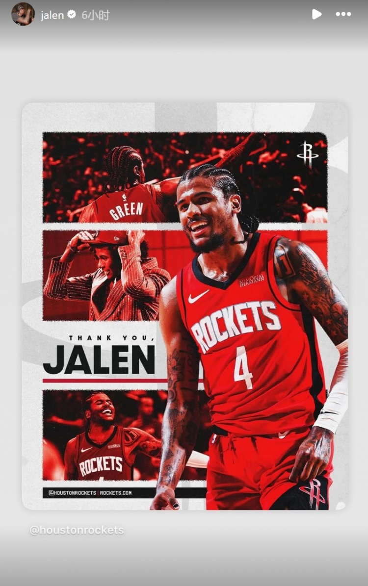 杰伦-格林在INS发图告别火箭,他写道:“休斯敦!!!感谢你们的一切🖤,你们从第一天起就给予我的支持和爱,我永远不会忘记🤞🏽这份情谊将永存🤘🏽。”