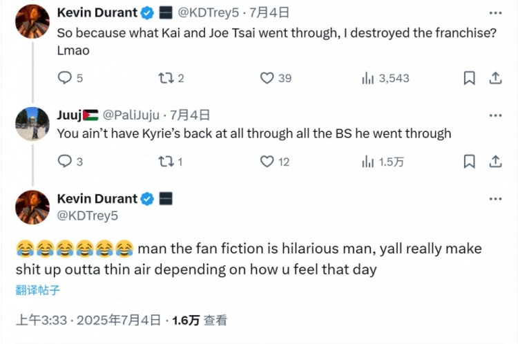 杜兰特:“😂😂😂😂😂😂兄弟,你写的同人小说也太搞笑了,你们真是全凭当天心情无中生有地编故事。”