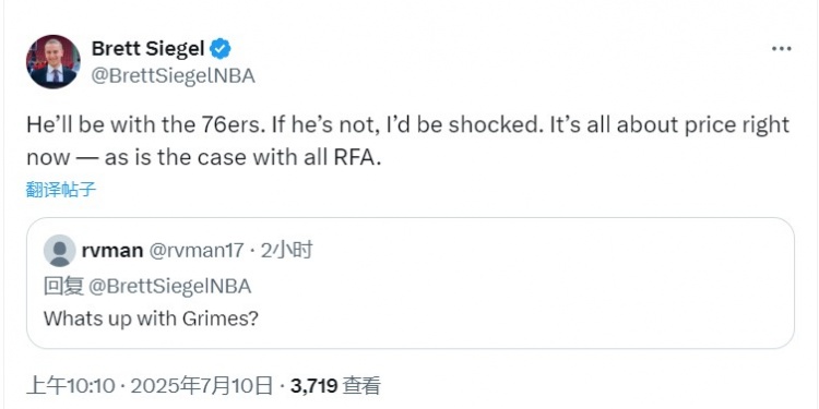 谈到格莱姆斯时,Brett Siegel表示:“他会留在76人。如果没有,我会感到震惊。现在的问题只在于价格,所有的受限制自由球员情况都是如此。”