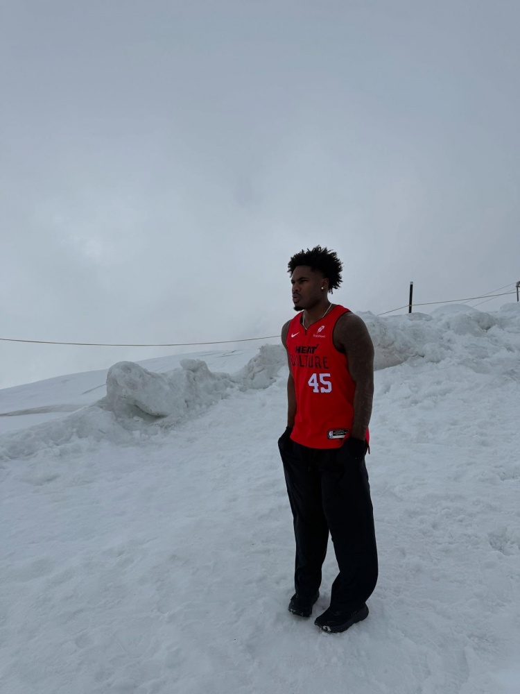 7月16日讯 近日,热火球员戴维恩-米切尔前往瑞士旅行。米切尔身穿印有自己外号“Off-Night”的球衣,站在冰天雪地中,略显寒冷。