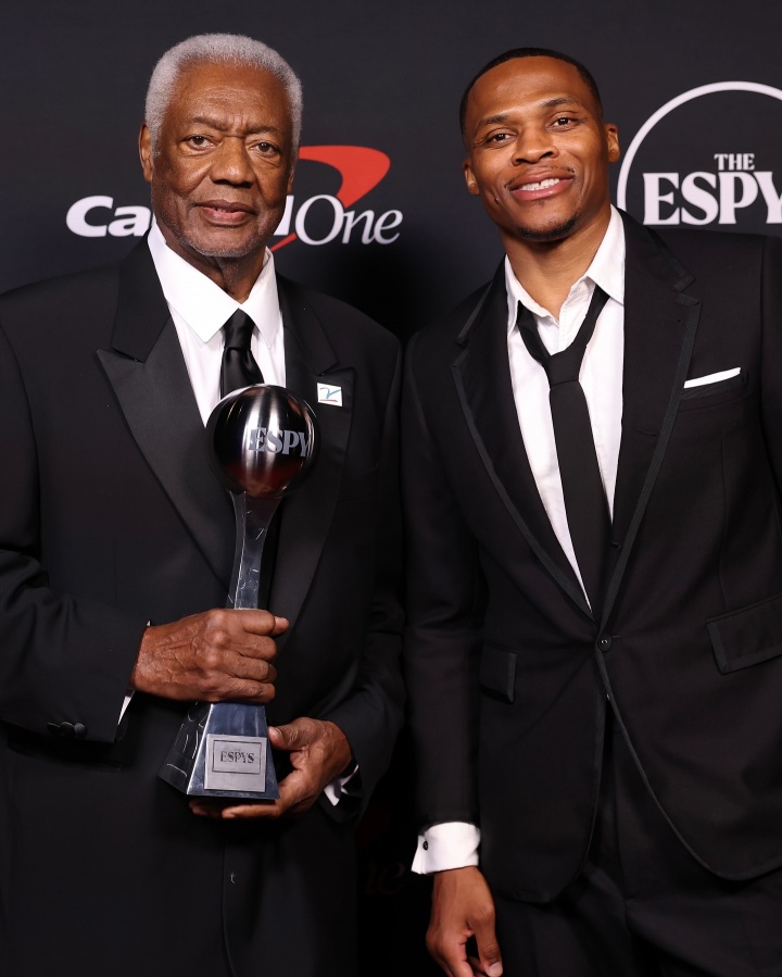 07月20日讯 近日,NBA球员拉塞尔-威斯布鲁克作为嘉宾在ESPY颁奖典礼上为奥斯卡-罗伯特森颁发了阿瑟-阿什勇气奖杯。