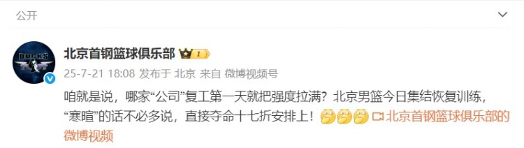 “咱就是说,哪家‘公司’复工第一天就把强度拉满?北京男篮今日集结恢复训练,‘寒暄’的话不必多说,直接夺命十七折安排上!”北京男篮官博在视频旁边写道。