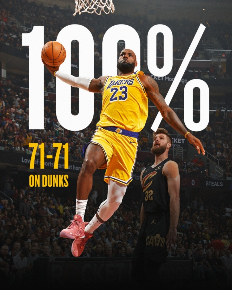 詹姆斯上赛季共尝试71次扣篮全部命中。