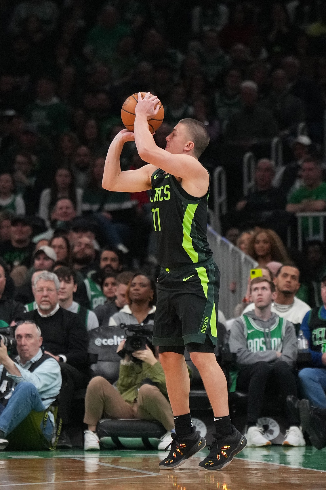 那在当时是一项NBA纪录,但这仅仅是个开始。上赛季,凯尔特人队以惊人的场均48.2次三分球出手领跑联盟。三分球出手次数排名倒数第一的掘金队场均也有31.9次出手,这个数字仍然比15个赛季前领跑联盟的魔术队多出6次。