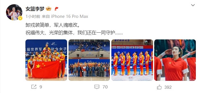 8月1日讯 今天是八一建军节,女篮球员李梦更新了个人社媒。