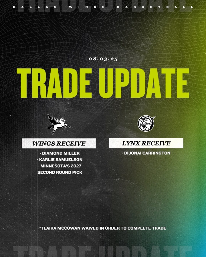 达拉斯飞翼队送出后卫迪乔奈-卡林顿,从明尼苏达山猫队得到戴蒙德-米勒(2023年选秀榜眼、司职前锋)、卡莉-萨缪尔森(赛季报销、司职后卫)以及一个27年的次轮签。