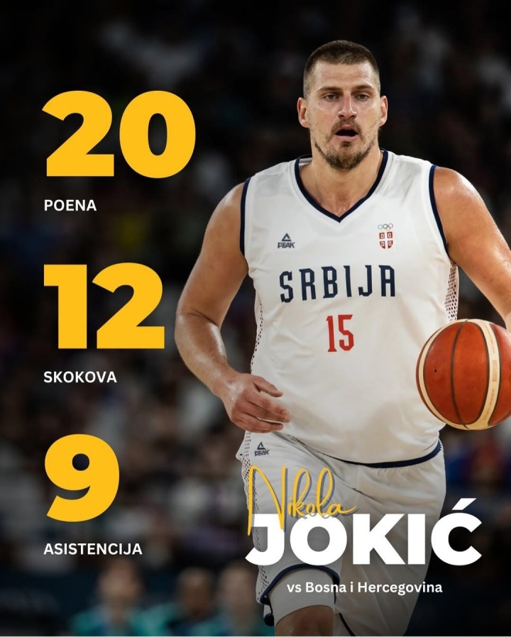此役,塞尔维亚巨星约基奇出战,他砍下20分12篮板9助攻的准三双数据。
