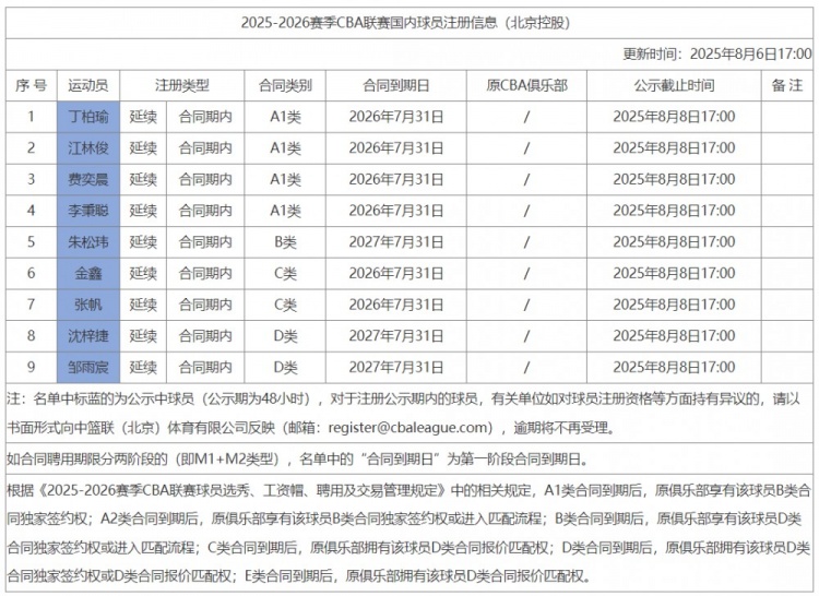 8月6日讯 今天,CBA官网更新了新赛季国内球员注册信息,其中北控注册了9名球员。