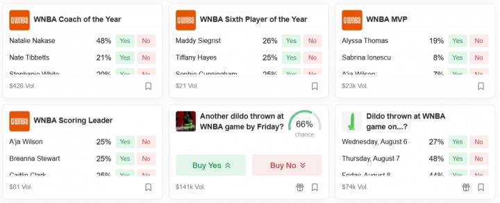 08月07日讯 链上博彩网站Polymarket显示,“周五比赛之前是否会有假阳具被扔进赛场?”的投注量已经超过了14万美元,远超WNBA的MVP、第六人等奖项的投注量。