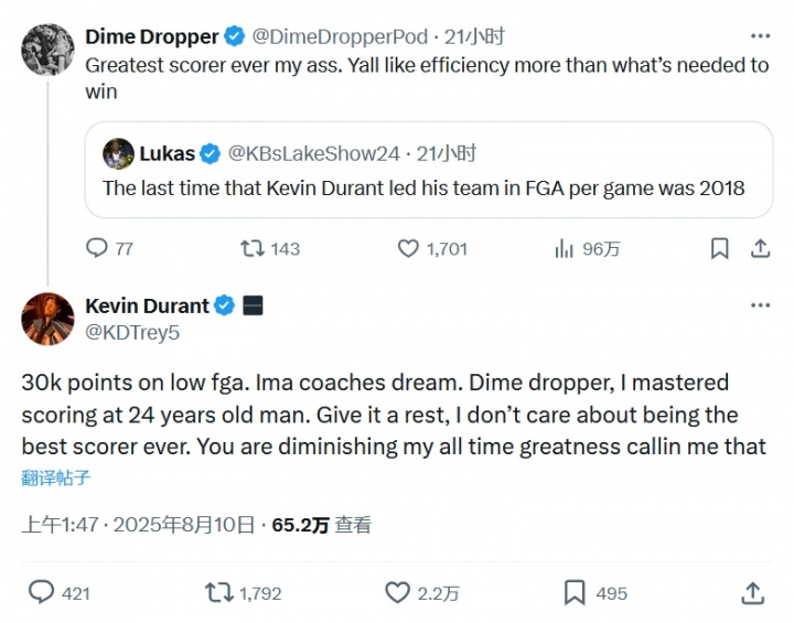 08月10日讯 休赛期的杜兰特继续与网友展开辩论。