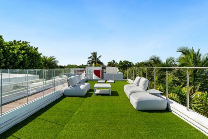 不仅如此,这里还有一个带篝火和电视的超赞屋顶休闲区,一个由车库改造而成的健身房,私人影院,定制吧台,45英尺(约14米)长的码头(带3个摩托艇泊位),以及一个带瀑布景观的游泳池。