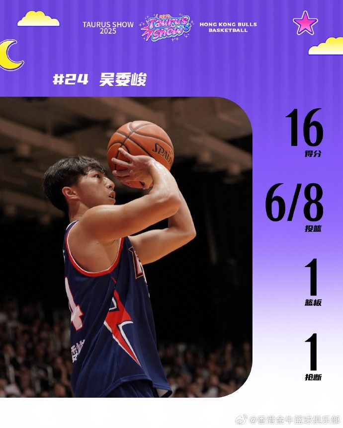 昨晚香港金牛在主场以95比56大胜湖北文旅!本场比赛,吴委峻带来惊喜表现,全场8投6中,砍下16分1篮板1抢断,卡尔顿以75%的投篮命中率,高效斩获15分8篮板1助攻,克罗斯稳定发挥,拿到13分12篮板8助攻的全面数据,董健在场上下起三分雨,拿下12分 1篮板1助攻,卢艺文化身高炮台,命中三记三分,贡献11分 7投4中 1篮板2助攻,杨睿骐也发挥出色,得到8分5助攻 2抢断!