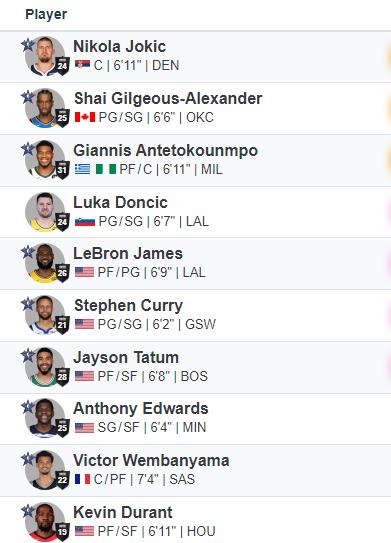 詹姆斯、杜兰特、库里、亚历山大、约基奇、字母哥、塔图姆、东契奇、爱德华兹、文班亚马。