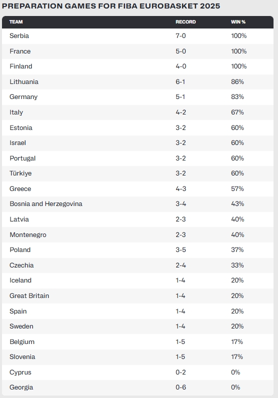 08月25日讯 2025年欧锦赛将于8月27日开打,各国球队也已打完了全部热身赛。