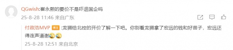 有网友表示:“崔永熙的要价不是吓退国企吗?”付政浩回复:“龙狮给北控的开价了解一下吧。你别看龙狮拿了宏远的钱和好苗子,宏远还得连声道谢。”