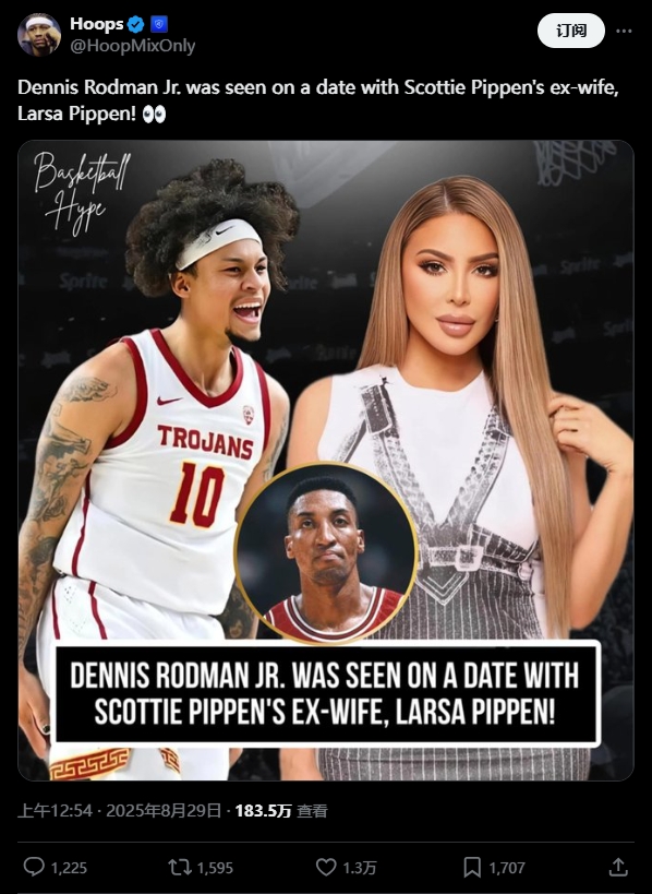 美媒:丹尼斯-罗德曼的儿子被拍到与斯科蒂-皮蓬的前妻拉尔萨-皮蓬约会!👀