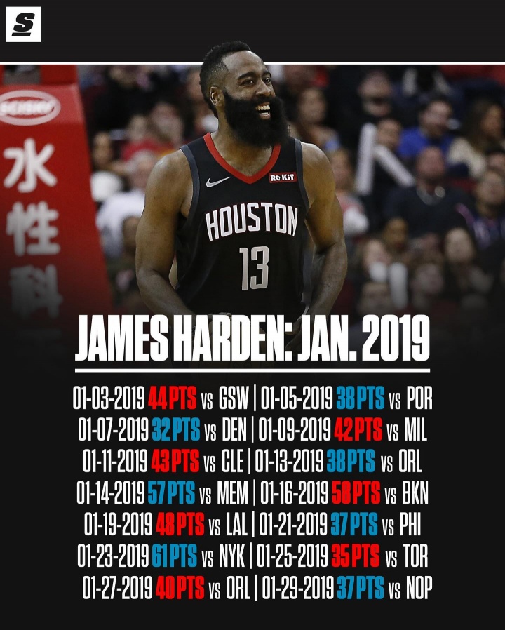 场均44+9+8!美媒回顾哈登19年1月:可能是NBA最伟大的单月表现