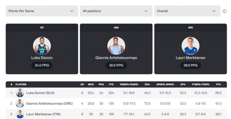 均率队进8强!东契奇欧锦赛场均34分排名第一 字母哥30分居次!
