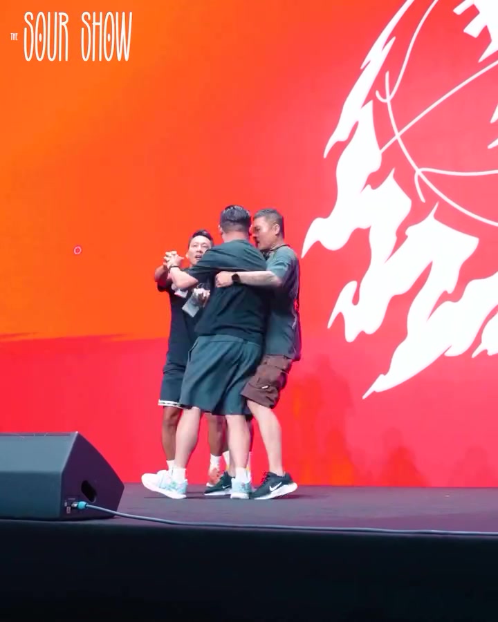 在活动临近结束时,一位激动的男球迷冲上舞台试图接近詹姆斯,被主持人和安保阻拦。期间,詹姆斯显得十分淡定,没有任何反应。在该冲动球迷被带下舞台后,詹姆斯无奈地摇头笑了笑。