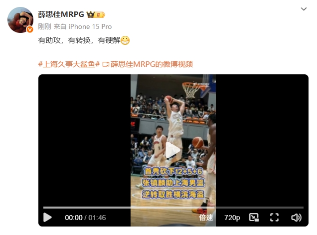 《东方体育日报》记者、上海队记薛思佳晒出张镇麟的集锦:“有助攻,有转换,有硬解[坏笑]”