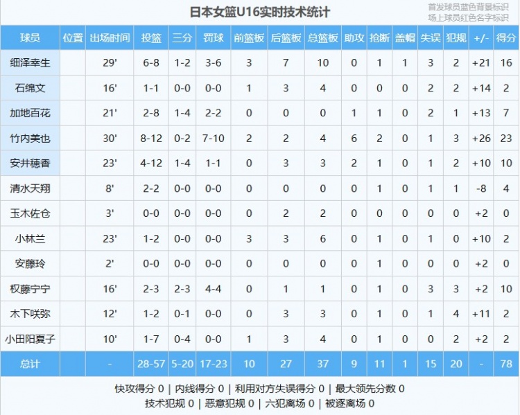 整场比赛,双方的整体投篮命中率有着较大的差距,其中,中国U16女篮全队62投仅18中,命中率为29%;而日本U16女篮全队57投28中,命中率为49.1%。