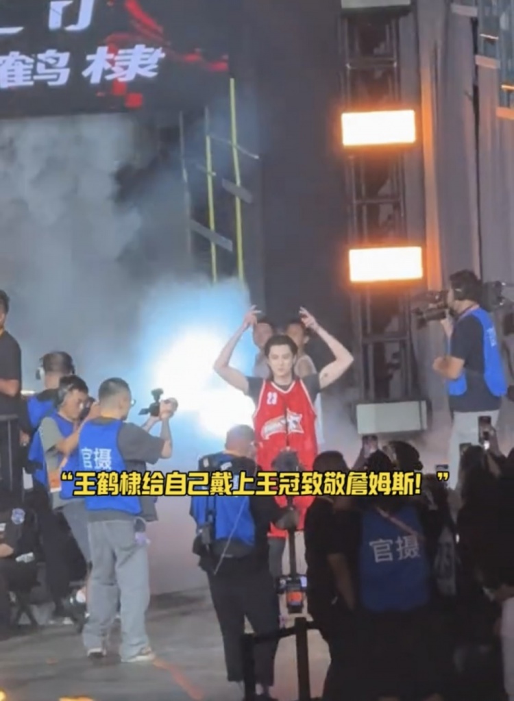 根据抖音用户@老麦 拍摄的视频,身穿23号球衣的艺人王鹤棣入场引发全场球迷欢呼,做出同款戴王冠动作致敬偶像詹姆斯。
