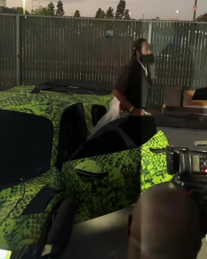 10月5日讯 今日快船球星哈登脚踏“蛇纹”配色9代战靴,搭配同款蟒纹车衣法拉利惊艳亮相《Starting 5》第二季首映礼。
