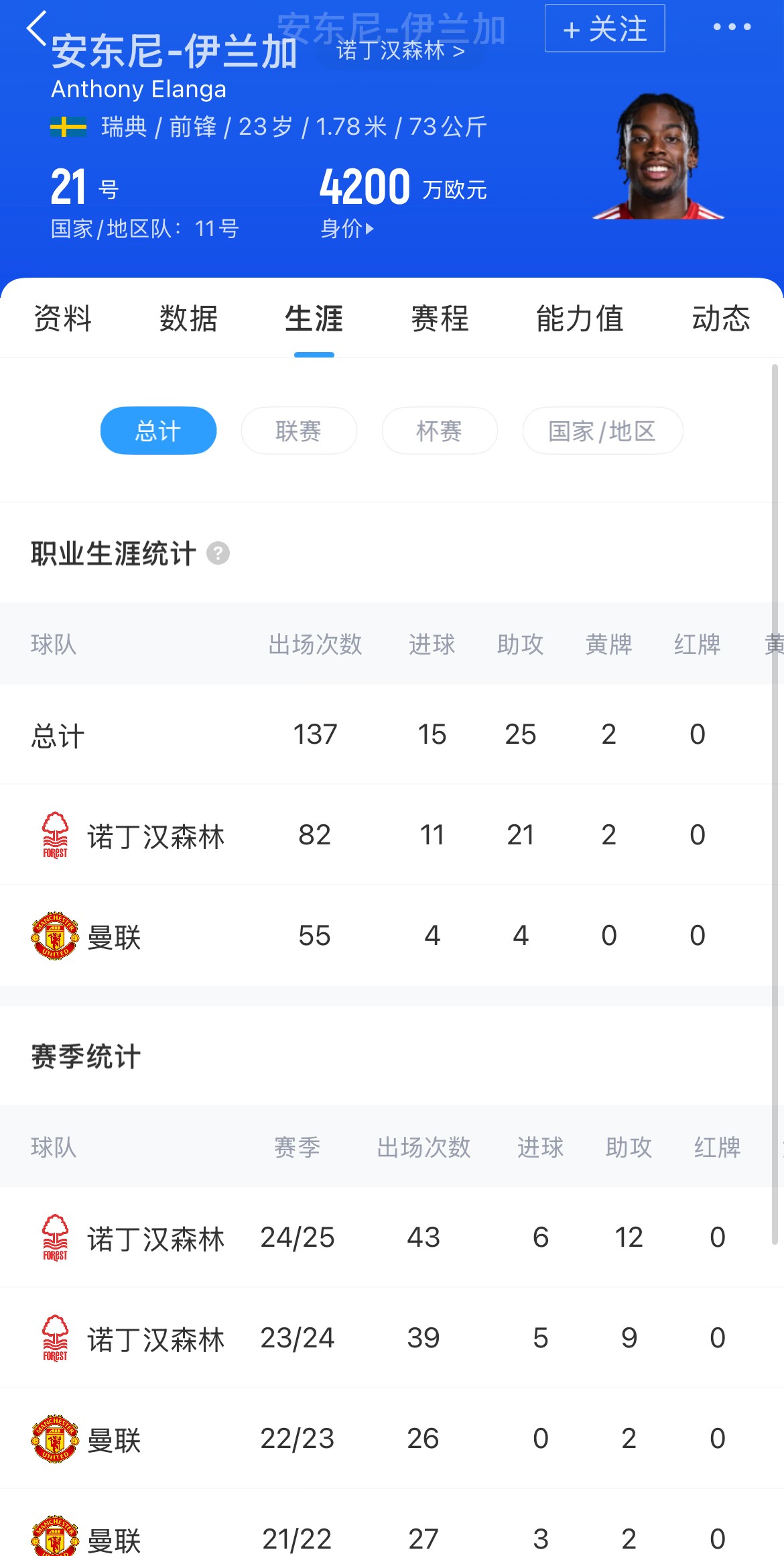 23岁的伊兰加在24-25赛季为诺丁汉森林出战了全部38场英超比赛,打入6球并贡献11次助攻。