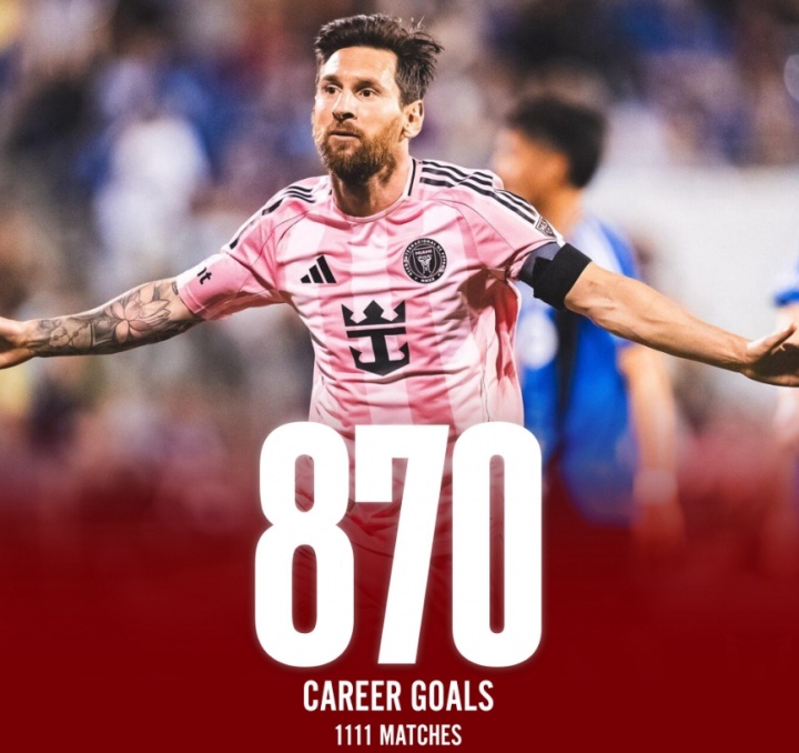 梅西10分钟内梅开二度,生涯进球总数达870球,所用场次1111场。