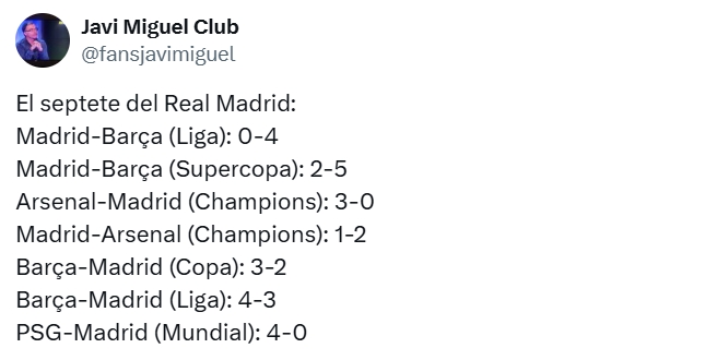 07月10日讯 阿斯报的著名巴萨跟队记者Javi Miguel晒出了皇马争冠关键比赛的七连败。