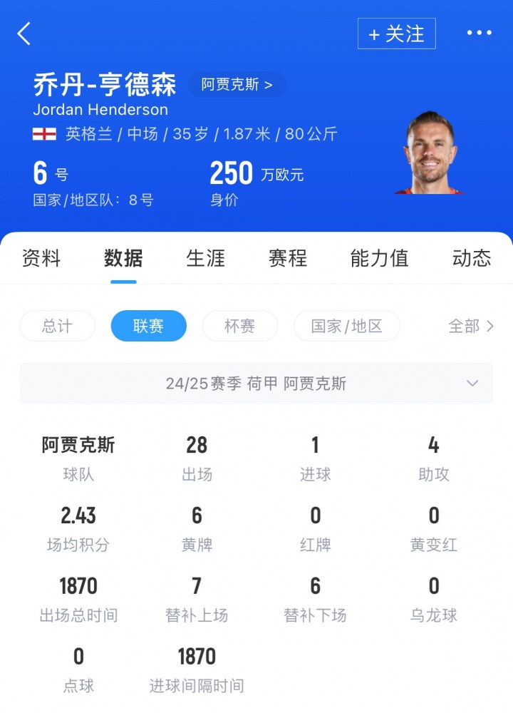 亨德森现年35岁,上赛季共为阿贾克斯出场45次,贡献1球6助攻。