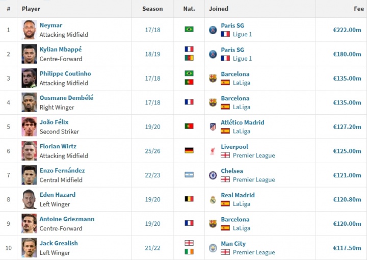 2017年,巴黎圣日耳曼以2.22亿欧元的价格,从巴萨引进内马尔,这笔转会已经过去近8年,但至今仍难以企及。转会费最接近内马尔的是姆巴佩,他在2018年夏天以1.8亿欧加盟巴黎。
