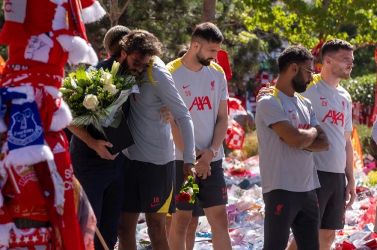 7月12日讯 利物浦全队及工作人员在安菲尔德向若塔和安德烈-席尔瓦表示哀悼,与两位兄弟的家人一同缅怀。