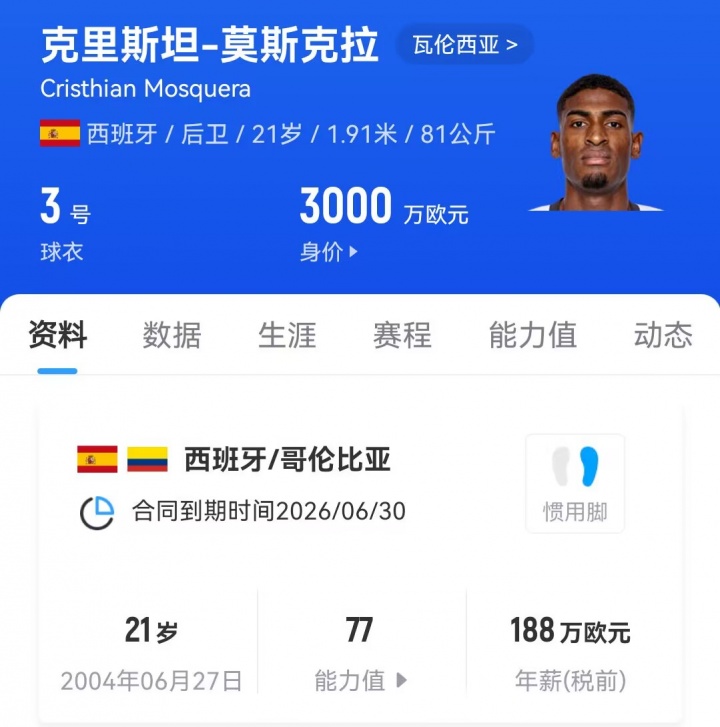 由于球员与瓦伦西亚的合同将在一年后到期,阿森纳得以用较低的价格签下球员。现年21岁的莫斯克拉目前的德转身价为3000万欧元。