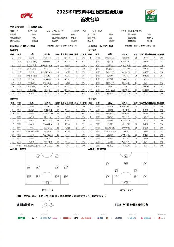 2025中超联赛第17轮 北京国安 vs 上海申花 首发名单 ​​​