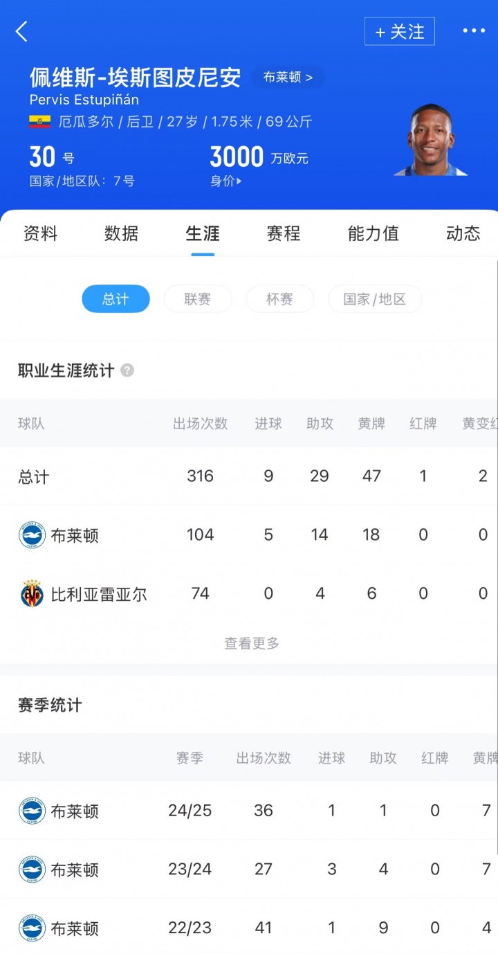 埃斯图皮尼安今年27岁,曾加盟乌迪内斯和沃特福德但都没能在比赛中上场。他曾租借效力于马略卡、奥萨苏纳、阿尔梅里亚等西甲球队,之后在2020年加盟比利亚雷亚尔,并且帮助球队赢得了欧联杯冠军以及杀入欧冠半决赛。他于2022年重返英超,以1800万欧元的身价加盟布莱顿,目前共计为布莱顿出场104次,打进5球,并有14次助攻。