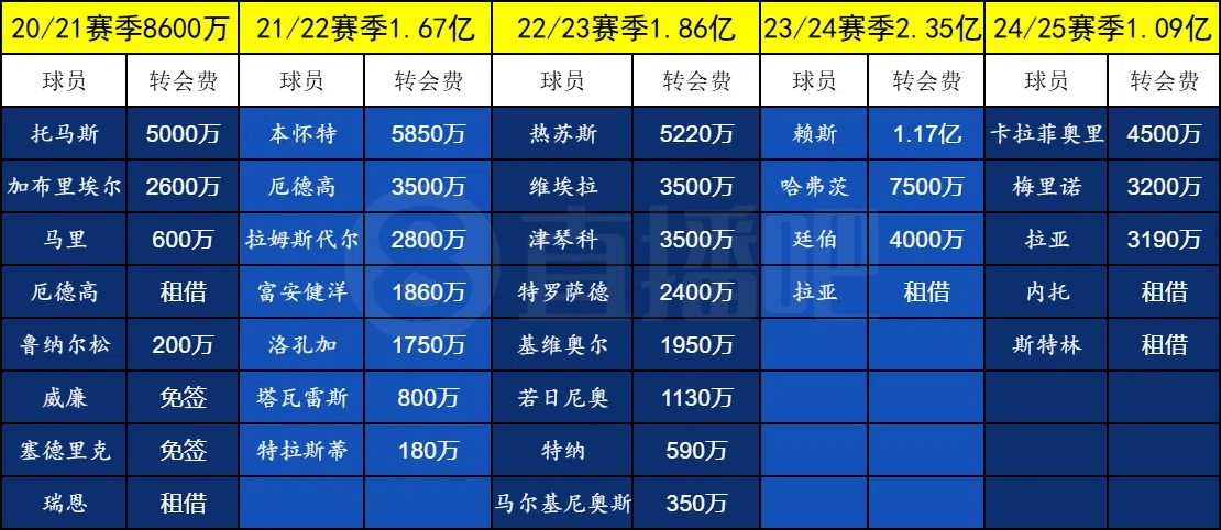 阿尔特塔执教阿森纳后已经经历了5个夏窗的引援,此前5个夏窗总计花费7.83亿欧元。在今夏,阿森纳已经官宣门将凯帕、祖比门迪、诺尔高和马杜埃凯。