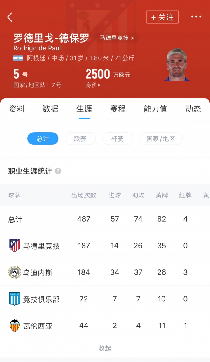 2021年德保罗以3500万欧转会费加盟马竞。目前代表马竞出场187场,打进14球并送出26次助攻。
