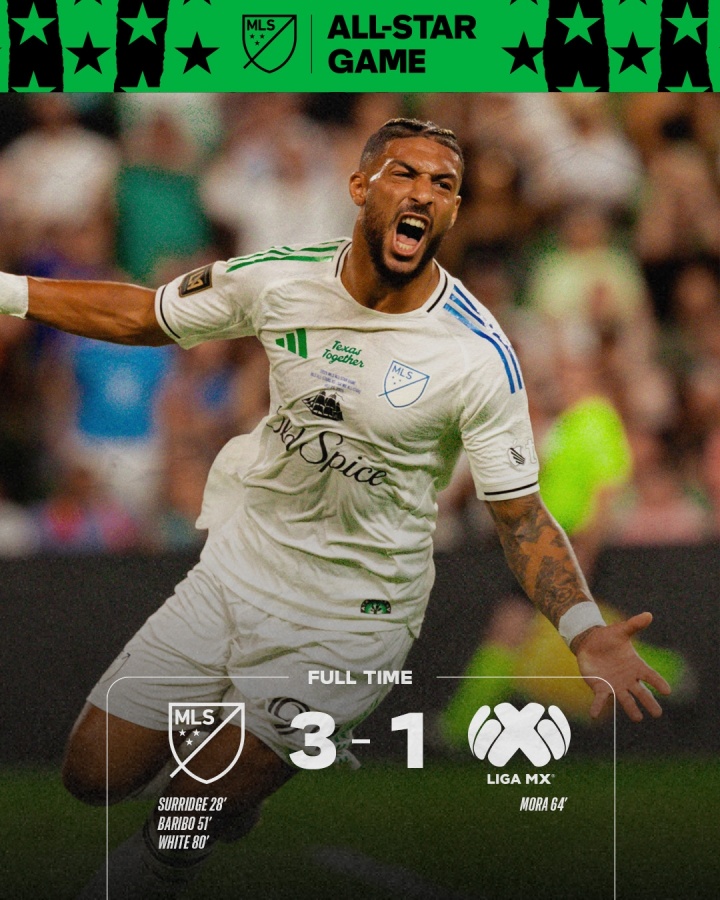 第80分钟,美职联全明星锁定胜局,布莱恩-怀特门前包抄破门,最终美职联全明星3-1胜出。