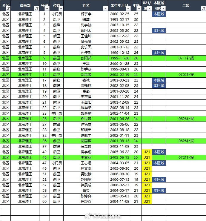 2025中乙联赛(北区)夏转后各队报名名单(绿色为夏转新报名球员)