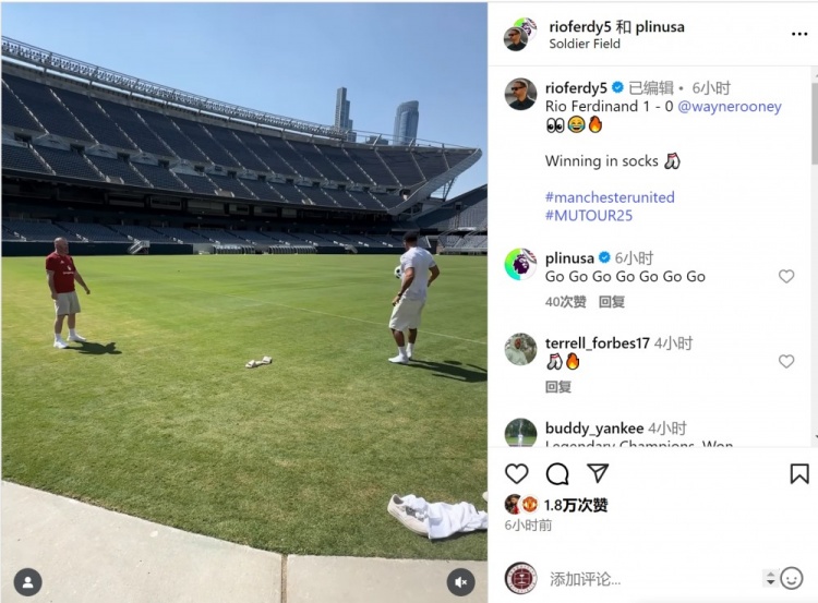 费迪南德社媒晒出视频,配文:“费迪南德1-0鲁尼,只穿球袜就赢了。”