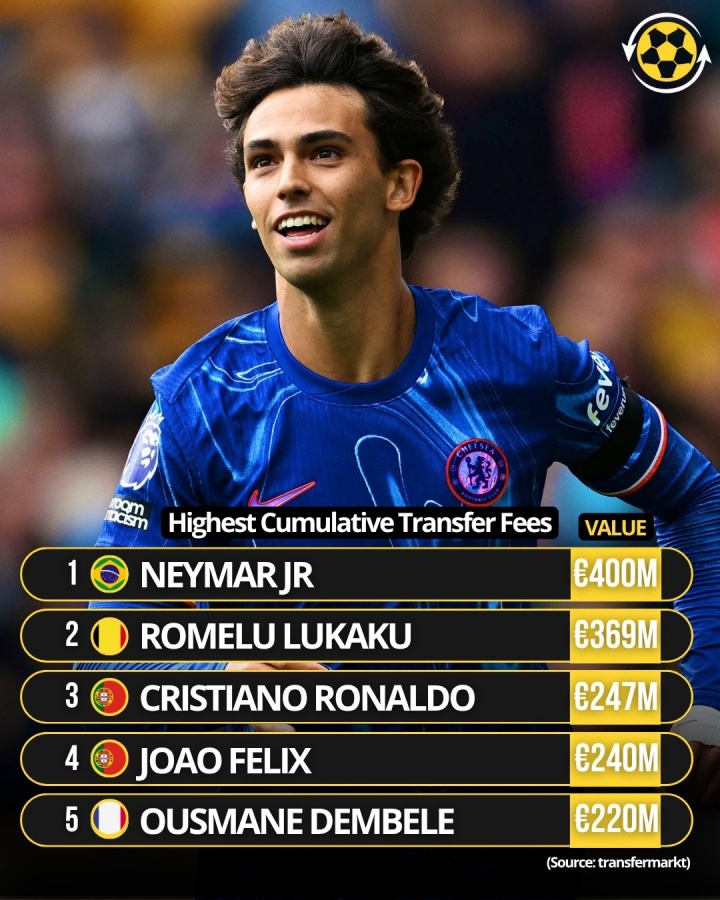 07月28日讯 在菲利克斯加盟利雅得胜利后,他的生涯累积转会费将会超越登贝莱,来到历史第4,仅次于内马尔、卢卡库和C罗。