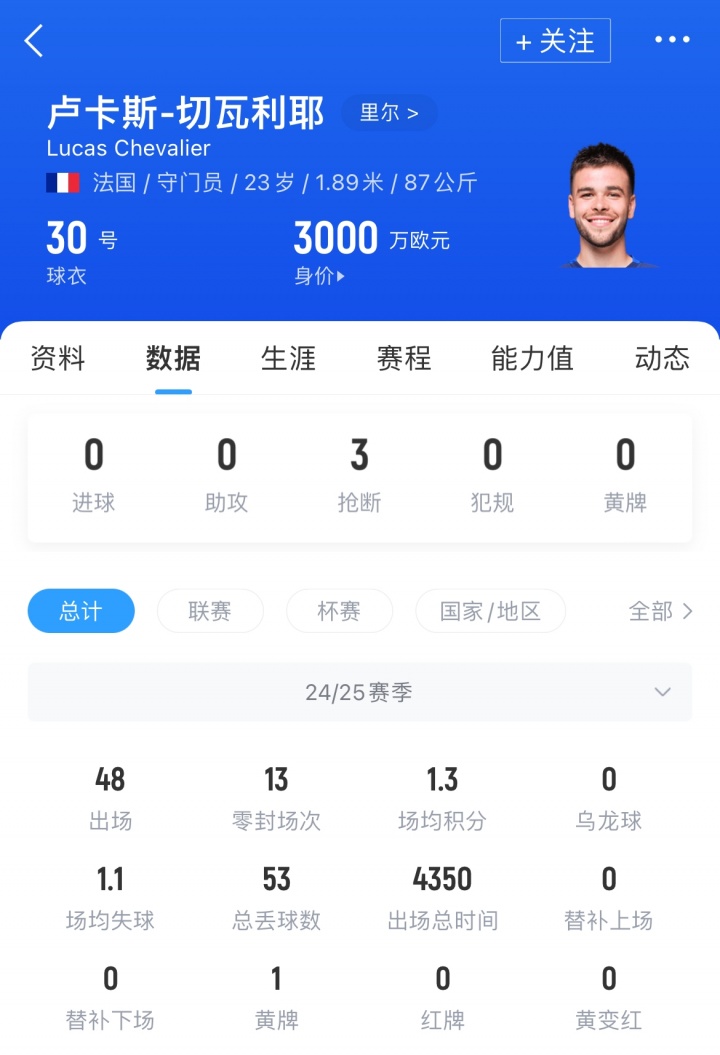 现年23岁的法国门将切瓦利耶上赛季为里昂出场48次,取得13场零封,场均失球1.1个。目前其德转身价达3000万欧元。