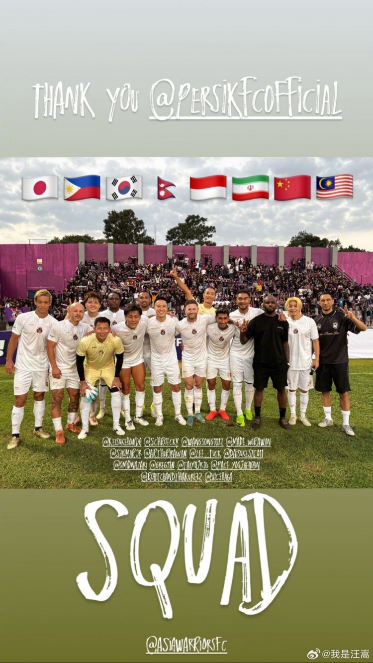 7月29日讯 今日,汪嵩更新社媒,晒出自己作为亚洲勇士队一员,随队前往东南亚展开为期十天的友谊赛之旅照片,照片中前日本国脚本田圭佑等在列。