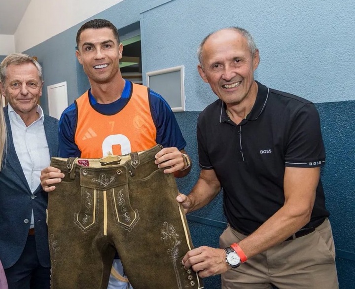 赛前,奥地利当地旅游部门负责人向C罗赠送了一条具有当地特色的手工皮裤,上面刻有克里斯蒂亚诺-罗纳尔多的名字,以此来表达对这位足坛传奇巨星的敬意与欢迎。