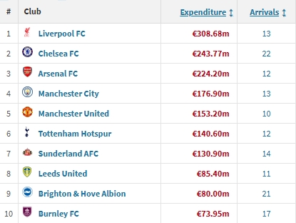 五大联赛夏窗引援花费:英超7队破亿&利物浦3亿领跑 西甲两极分化
