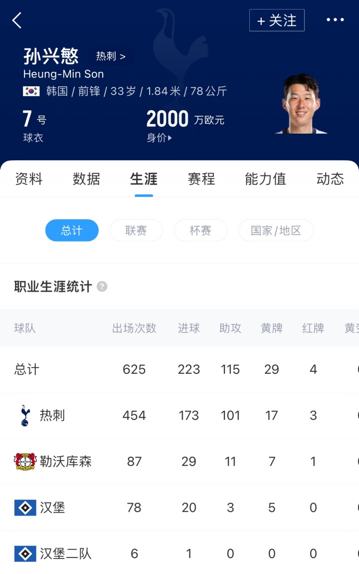 孙兴慜为热刺共计出场454场,获173粒进球和101次助攻,为热刺取得1次欧联杯冠军。