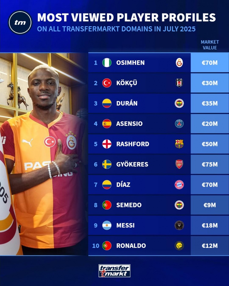 8月3日讯 德国转会市场统计了球员、俱乐部资料7月份的浏览量,并列出榜单,球员方面奥斯梅恩居首,俱乐部方面加拉塔萨雷夺魁。