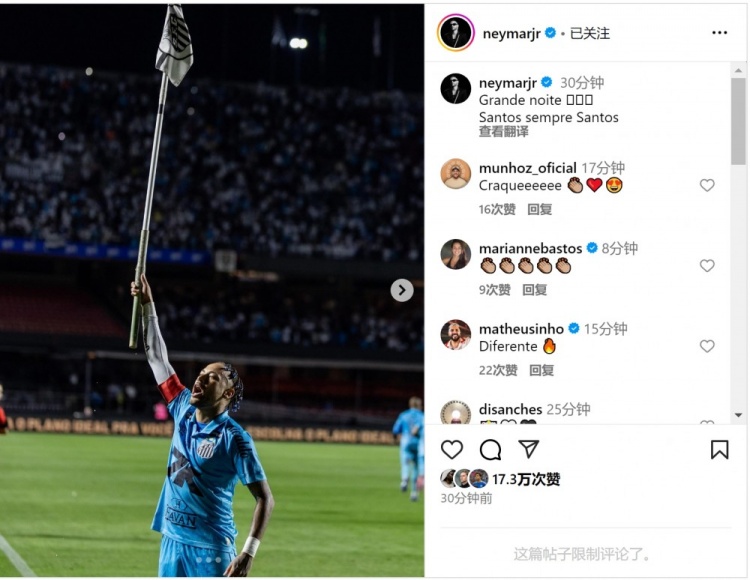 内马尔社媒晒出高举角旗杆庆祝的照片,配文:“美妙的夜晚,桑托斯永远是桑托斯。”
