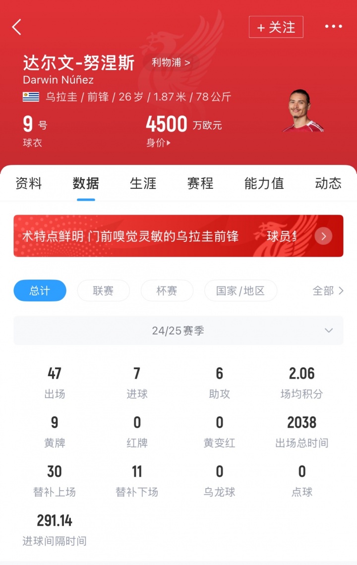 努涅斯现年26岁,司职前锋,利物浦在2022年夏天花费8500万欧元将其从本菲卡签下。效力红军至今,努涅斯出场143次,贡献40球26助,随队获得一次英超以及联赛杯冠军。目前努涅斯德转身价为4500万欧元。
